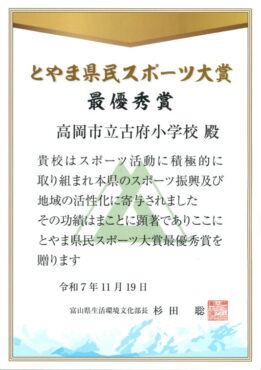 古府小学校が「とやま県民スポーツ大賞」の地域活性化部門で、最優秀賞を受賞しました。これは、スポーツを通じた地域の活性化や子供の体力向上に貢献した個人や団体を表彰するものです。