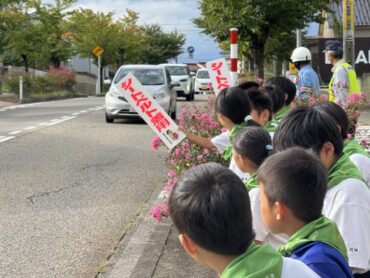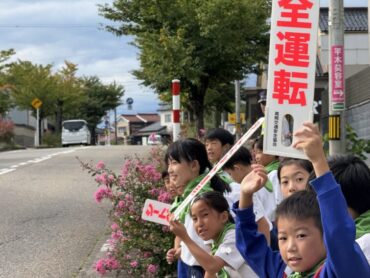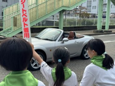 通りかかる自動車、バス、タクシー等に元気よく「交通安全!」「シートベルト着用!」と大きな声で呼びかけました。