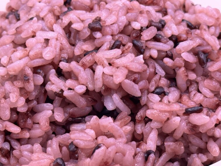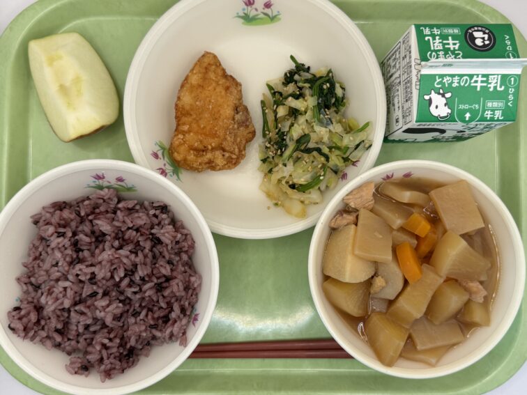 今日の給食では、食べやすいように白い米に雑穀の「香紫米」を混ぜた「赤米ご飯」にしました。