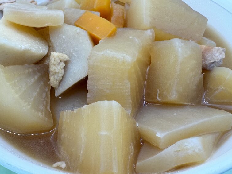 「かたかご煮」は、片栗粉で とろみをつけた煮物です。この片栗粉は、現在じゃが芋のでんぷんから作られますが、昔は、「かたかごの花」の根から作られていました。「かたかごの花」は紅がかった明るい紫色をしています。みなさんが毎日使っている給食の食器にも、「かたかごの花」の絵が描かれていますね。