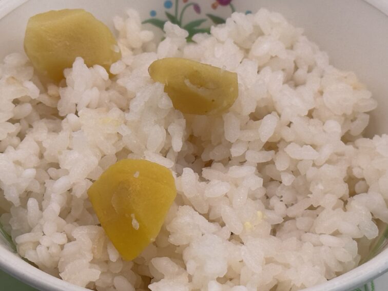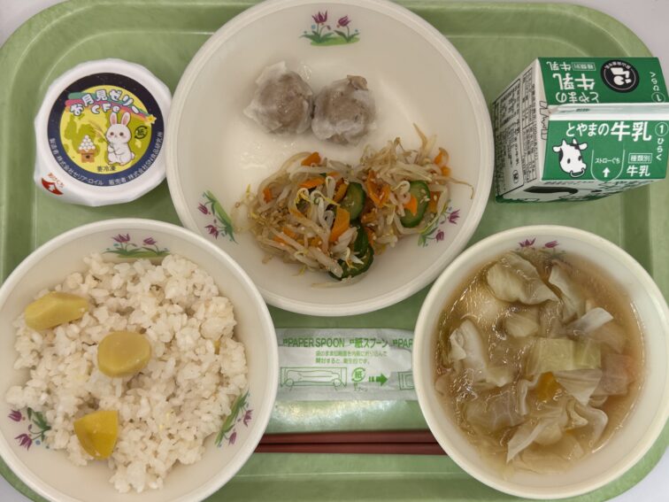 今日の給食は、お月見にちなんで「栗ご飯」、「団子汁」、「お月見ゼリー」が登場します。よく味わって食べましょう。