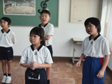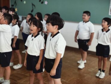 音楽の授業です。内容は、学習発表会のステージ発表で、最後に歌う歌「メッセージ」の練習です。いろいろな国の挨拶が出てくるので、その部分を特に練習していました。覚えるのがちょっと難しそうでしたが、元気に言いましょう!