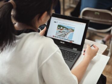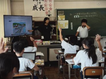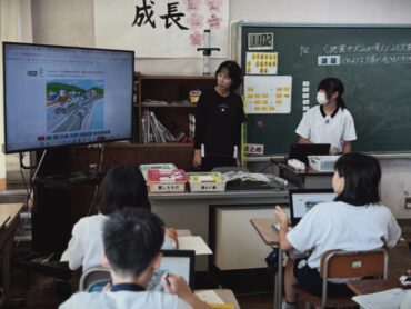 理科の授業で、先日からの地震の学習の続きです。学習専用端末の図を見て、地震が起きた時に危険が予想される場所をタッチペンで囲んでいました。土砂災害、地割れ、津波等、気付いたことを発表しました。