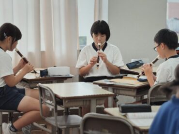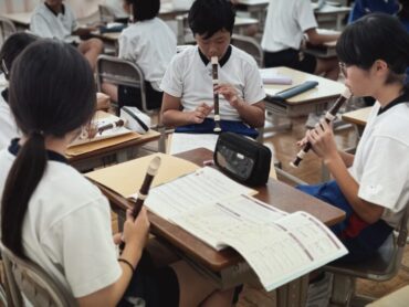 音楽の授業でリコーダー演奏をするところでした。楽譜を見ながら、グループを二つのパートに分けました。決まったグループは早速練習を始めました。リコーダーの音色が美しく響き合うように、演奏しましょう。