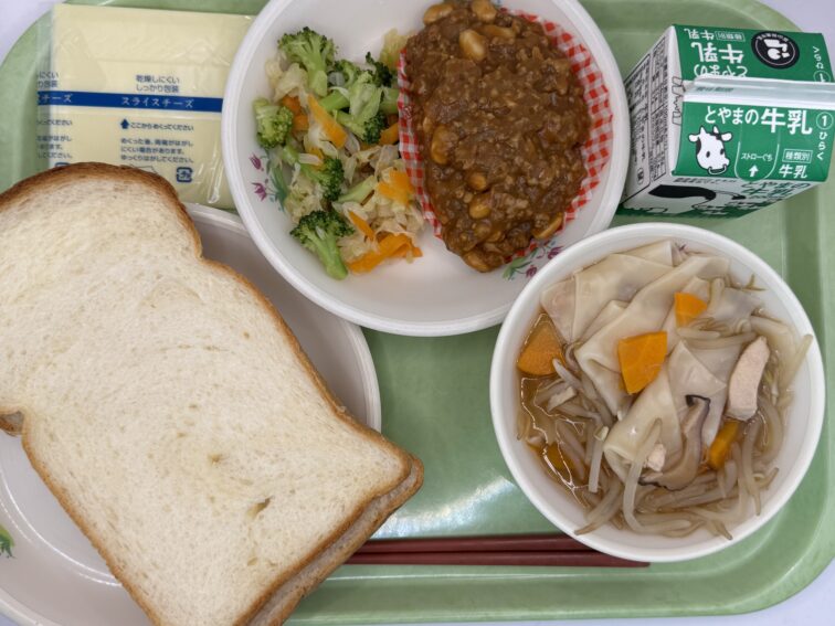 今日の給食はセルフサンドです。給食準備前にしっかり手を洗いましたか?食パンに好きなおかずやチーズをはさんで食べましょう。お肉は、カレー味でチーズと相性抜群です!