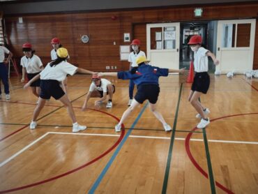 体育でタグラグビーをしています。長い手と脚で相手をブロックしますが、そのすきまをかいくぐって前進しています。
