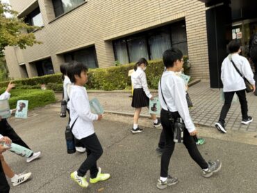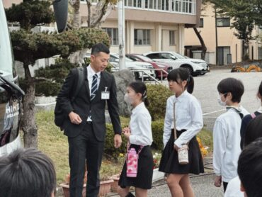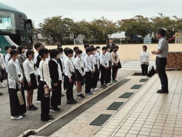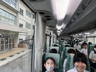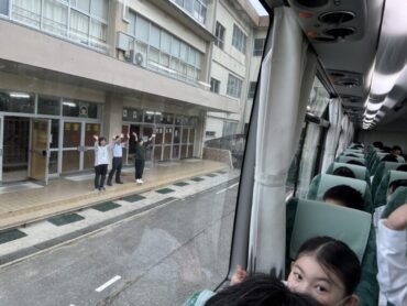 校長先生、教頭先生のお話の後、バスに乗り込みました。見送りの先生方に手を振って出発です。