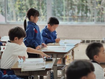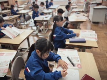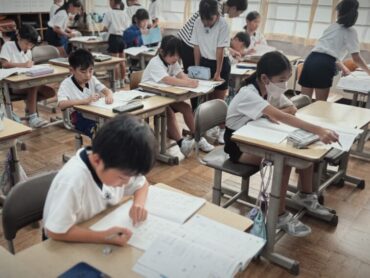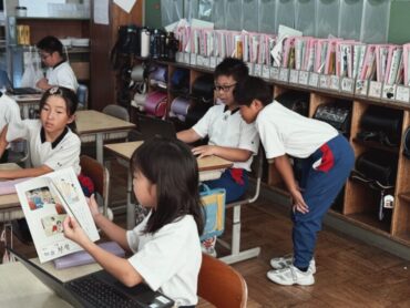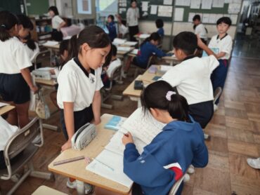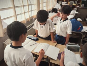 算数で先日から学習してきたかけ算の筆算の問題をノートに書いて、解きました。先生に見てもらい早く合格できた児童は、「ミニ先生」になって友達のノートを見て丸付けをしていました。ノートの数字をしっかりと確認し、慎重に丸付けをしていました。