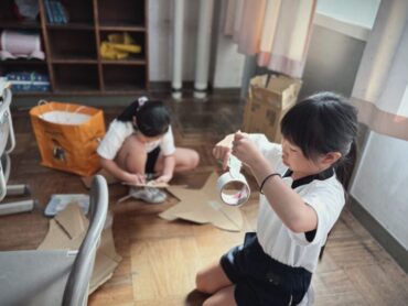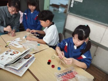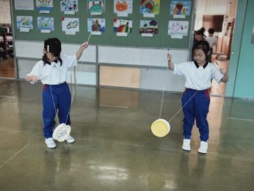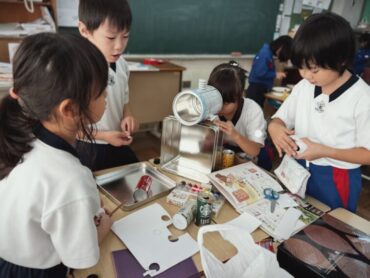生活科で作っていた遊び道具ができてきたようです。少し難しそうなものもあり、班のみんなで教え合ったり、手伝ったりして、話しかけても返事も帰ってこないくらいに製作に集中していました。