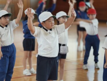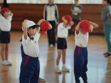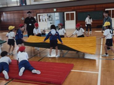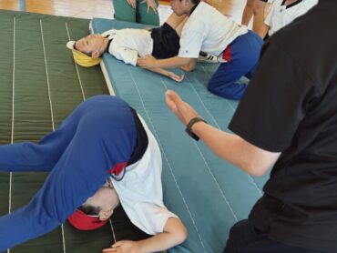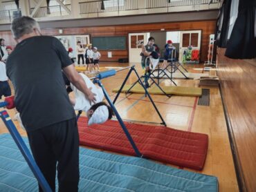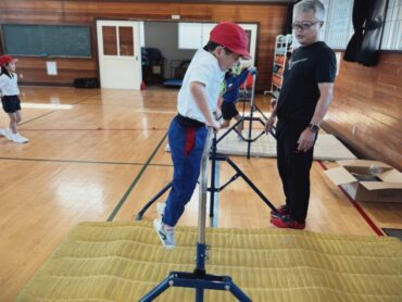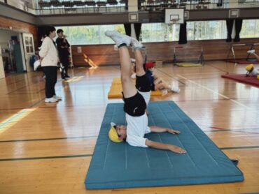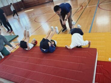 今度は前回りおりです。少し怖いなと感じている児童もいたようですが、補助をしてもらってできていました。