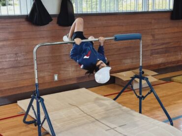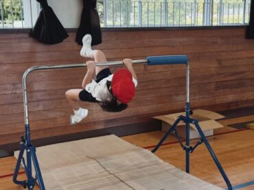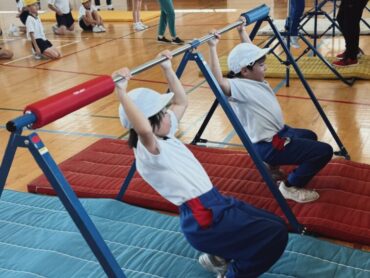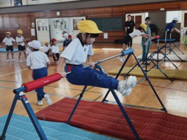 次は鉄棒です。乗って3回両足を前後に降り、勢いをつけて後ろに降りました。みんな上手にできました。