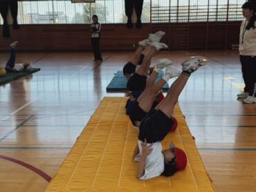 いったん鉄棒から離れて、マット運動をしました。ゆりかごをして、ゆりかごから首倒立のような態勢をとりました。きれいにできていますね。
