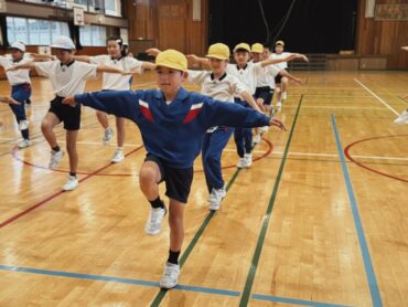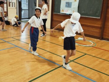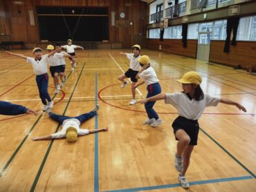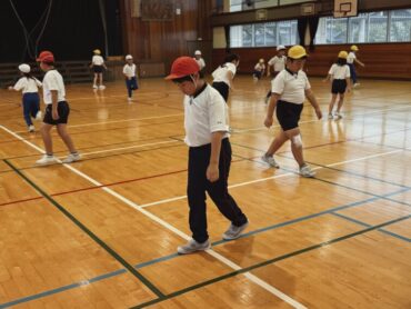 体育で体つくり運動を行いました。「四つの島で動きを高めよう、増やそう! 4の1 かがやき☆アドベンチャー」という楽しいタイトルがついています。今日は四つの島の一つ「おっとっと島」に挑戦しました。体育館のラインに合わせて歩いたり、片足立ちをしたりしました。おっと!早くもバランスを崩して大の字になっている児童が……。