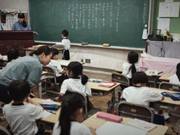 教室で歌のテストをしていました。担任の先生のオルガンの伴奏に合わせて「いつまでも ともだち」を歌いました。他の1年生は自分の順番が来るまで静かに漢字練習を頑張っていました。