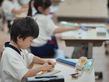 1時間目は算数でした。「7+4のけいさんのしかたをせつめいしよう」という課題です。算数セットからブロックを取り出し、七つと四つに分けて並べ、操作しながら考えました。