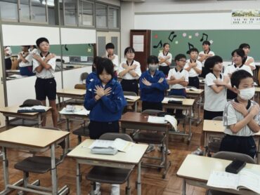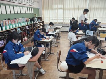 音楽の授業です。音楽交流会も終わり、今日はワークシートで和音の勉強をしていました。その後、先生がピアノで弾く和音を聴いて、当てるという問題をしました。どの和音かは体で表します。聴き分けるのはちょっと難しそうでした。合っていたかな?