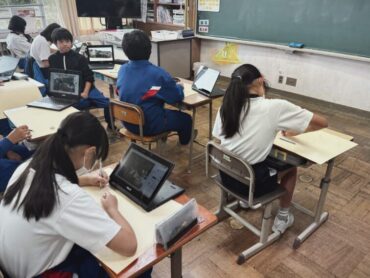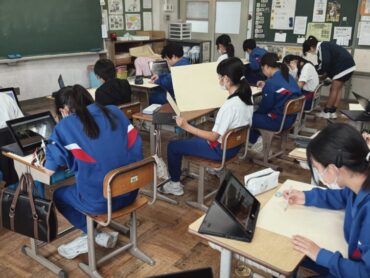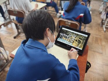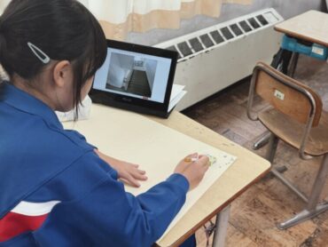 教室に戻った6年生は図工の作品づくりの続きに取り掛かっていました。学習専用端末を広げて、清書用の紙に下描きしていました。複雑な遊具を描くことに挑戦していますね。