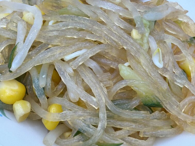 今日はバンサンスーに使用している春雨についてのお話です。春雨は、中国で生まれた食べ物で「緑豆」という豆が原料になります。緑豆以外にもじゃがいもや、さつまいものでんぷんから作られるものもあります。給食では緑豆から作られた春雨を使用しています。緑豆春雨はコシが強くツルツルとしているのが特徴です。日本には今から800年ほど前の鎌倉時代に伝わってきました。春雨を作っているときの様子が、細かく静かに降る 春の雨のようだということから春に雨と書いて「春雨」と言われるようになりました。