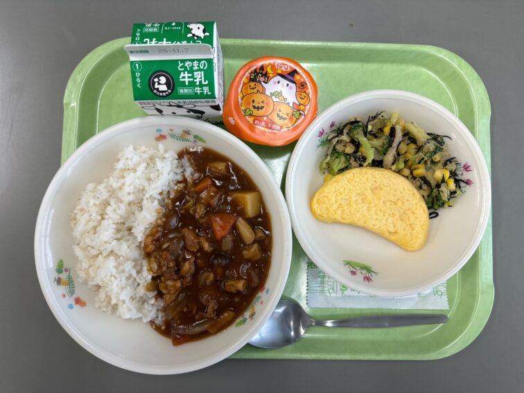 今日の給食では、ハロウィンのかぼちゃのランプにちなんで、デザートをかぼちゃプリンにしました。夏に採れる南瓜ですが、冬まで保存することができ、採れたてよりも熟成されておいしくなります。また、ビタミンCやビタミンE、βカロテンが多く、風邪や生活習慣病の予防にも効果があります。今日は給食でハロウィン気分を味わってください。