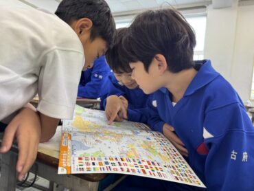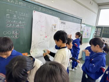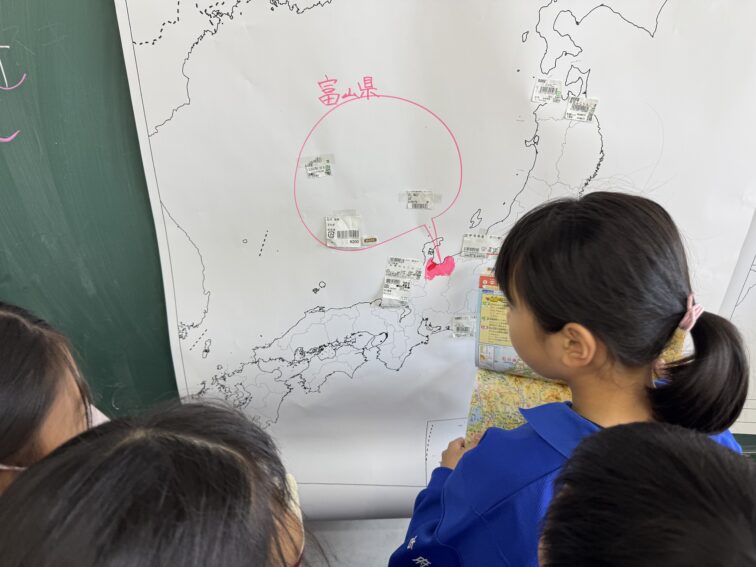 社会科の時間に、食品の産地を調べていました。家庭から持ち寄ったレシートや食品の袋を見ながら、日本のどこで取れたものなのかを読み取っていました。地図帳を使って、友達と相談しながら地名を探し、黒板の白地図に位置付けました。