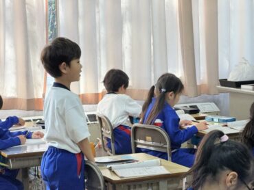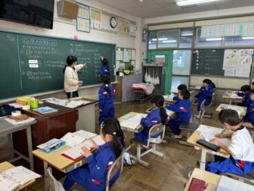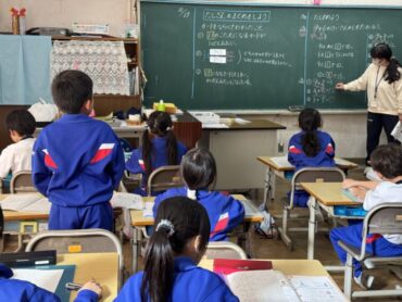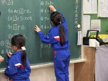 算数の時間にたし算のたしかめ問題をしました。教科書の問題を解いて、早く終わった1年生は黒板に答えを書きに行っていました。問題を担当した児童が答えを言ってみんなで丸付けをしました。