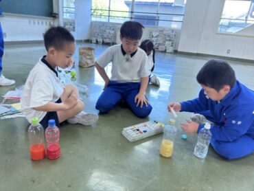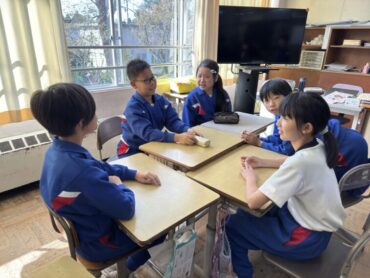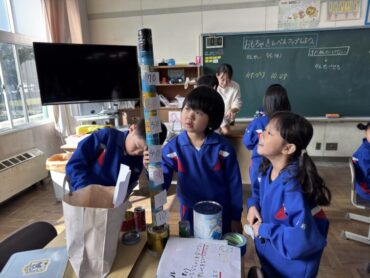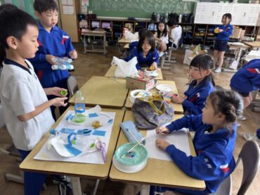 生活科のおもちゃ作りも完成が近付いてきました。もうできているグループもあるようです。作っているうちにだんだんイメージが膨らんできたのか、大きなおもちゃができてきているグループも見られました。わくわくしますね。