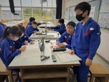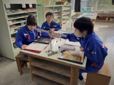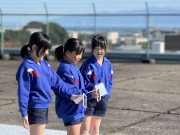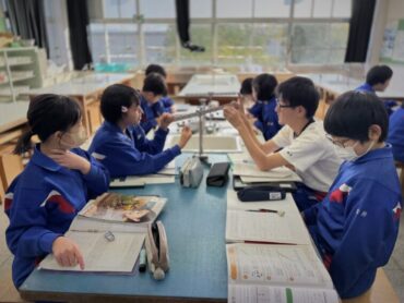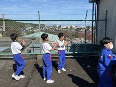 理科の学習では屋上で鏡を使って実験をしていました。よく晴れて、光の反射がよく見えました。遠くの雪をかぶった立山も美しかったです。
