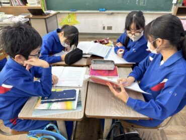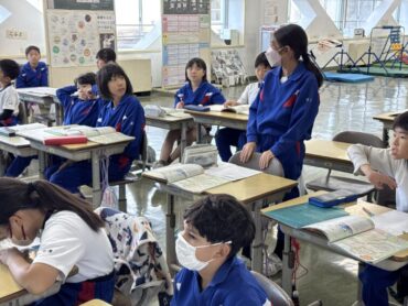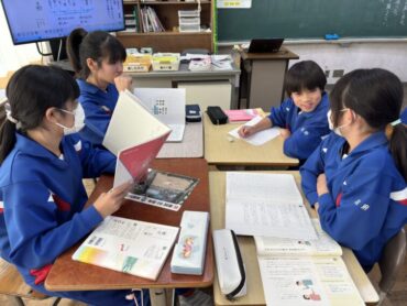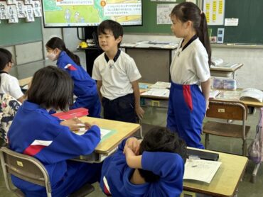 3年生は算数の授業です。課題は「○○算になるか考えて、問題をとこう。」でした。問題を見ると、3年生が、かけ算かわり算か迷うような文章でした。分かった児童は、まだ迷っている児童に説明をしました。友達の説明はとても分かりやすかったようです。