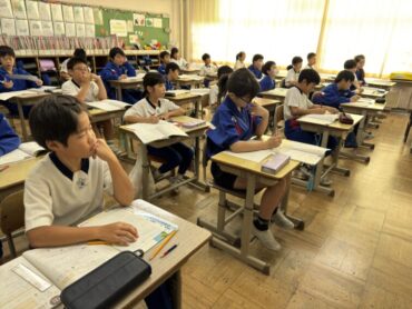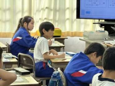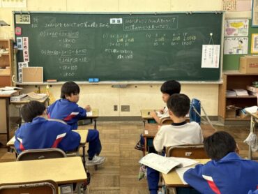 4年生も算数の授業でした。計算の決まりを利用して、問題を解きます。普通に考えたら筆算しないと答えが分からない難しい計算も、計算の決まりを利用すれば、速く正確に計算できることに気付きました。ただ、どの計算の決まりを使うのか気付くのに時間がかかるようです。