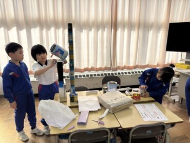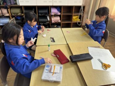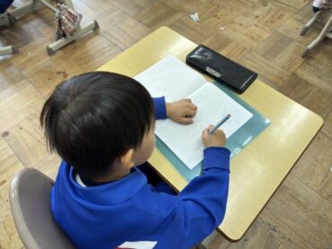 生活科のおもちゃ作りも完成間近のようです。今日は、そのコーナーで他の友達に遊んでもらう時のルールや説明を書いたり、読んだりしていました。景品の折り紙を熱心に追っているグループもありました。