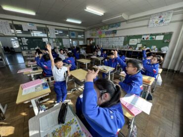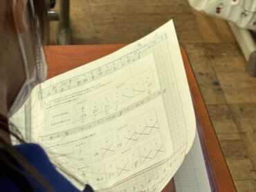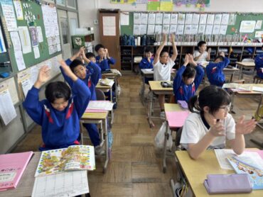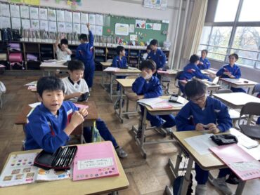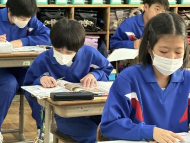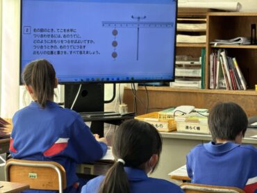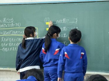 理科でてこの学習のまとめをしているところです。てこをつり合わせるには、右のうでにどのようにおもりをつるせばよいか、考えました。ノートを開いて、以前の実験記録を振り返っている6年生も見られました。大事なことですね。しばらくして、児童が黒板に答えを書き、答え合わせをしました。。
