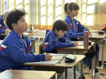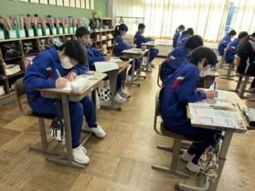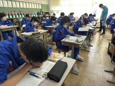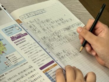 社会科の授業で、江戸時代の親藩、譜代、外様の大名配置の授業でした。徳川家康の狙いは何だったのか、教科書や資料集も使って考え、予想をノートに書いていました。よく考えていますね。