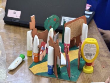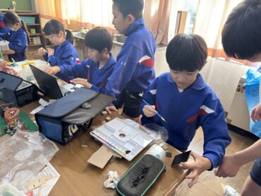 図工の作品はほぼ完成です。「ほぼ」、というのは、あと少しだからです。部品を接着剤でつけたり、色を塗ったりしていて、もう、それができたら「完成」なのですが。下の画像も、絵の具やボンドの入れ物を利用して、切った板を立たせて接着しています。完成した児童は、名札を作って先生に確認してもらいました。
