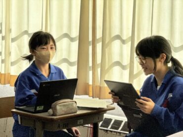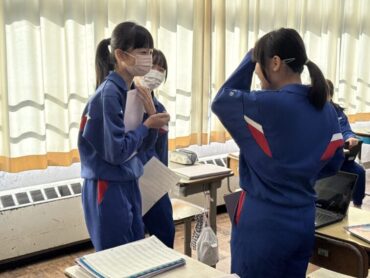 英語では、行きたい外国の場所やそこで見たい物、食べたい物、したいこと、をスピーチしました。以下の写真は発表前の友達との練習の様子です。発表では、みんなとてもスムーズに言えていました。