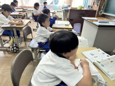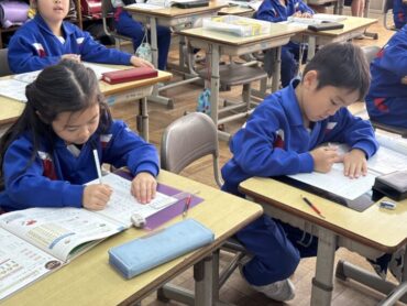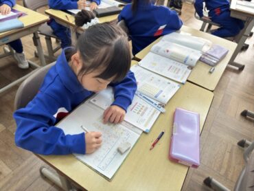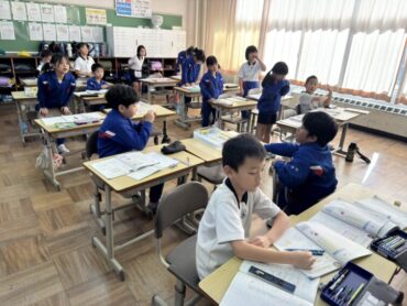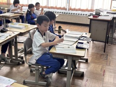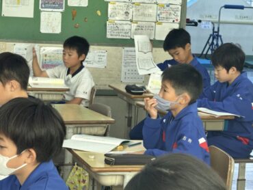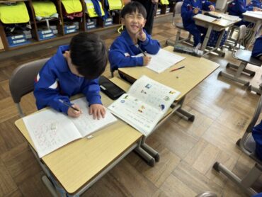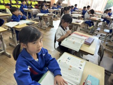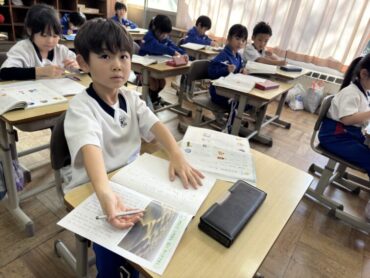 昨日に続いて、4の段の九九の勉強です。黒板に書かれた九九の票を見ながら、全員で→男子全→女子全というように順番に声を合わせて言いました。すらすらに言えるように練習しましょう!