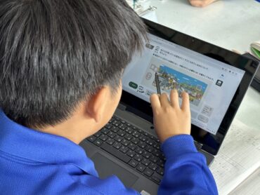 理科「電気とわたしたちのくらし」の授業で、「電気が作られている場所」、「電気が使われている場所」について考えました。学習専用端末で教科書の二次元コードを読み取ると、画面に町のイラストが表示されました。それを見ながら、指やタッチペンで枠を操作して、電気が作られている場所・使われている場所を見付けました。