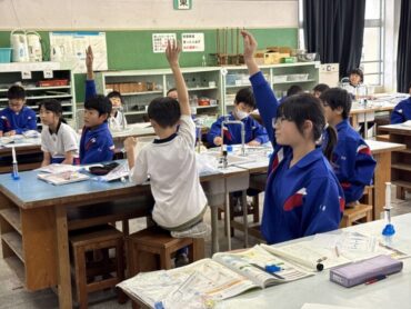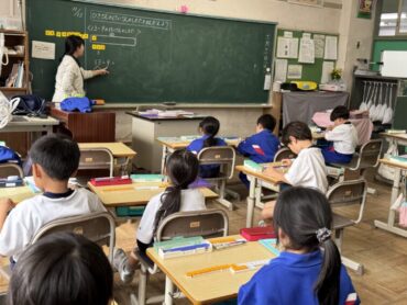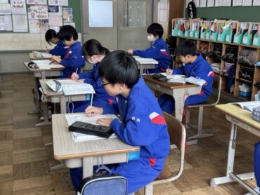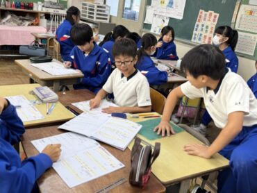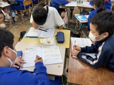 算数で比例の授業でした。1組は比例の表からXとYの関係を見付けて、式で表す課題に取り組みました。その後、学習したことを生かして、練習問題に挑戦しました。進んで友達に教えたり、尋ねたりする様子が見られました。
