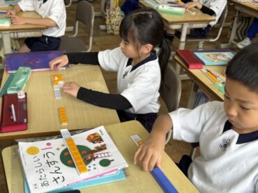 算数の時間に13-9= の繰り下がりのある引き算の勉強をしました。どのように計算すればよいのか、ブロックを使って操作活動をしながら考えました。低学年の児童には大事な手立てです。