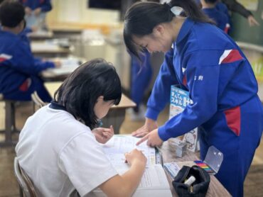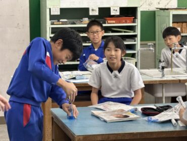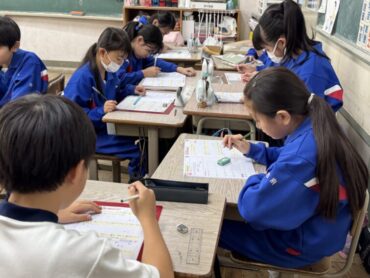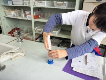 4時間目は理科室で、ピストンを押したときの空気と水の様子との比較の実験をしていました。自分の予想を水を入れて思いっきりピストンを押して確かめました。