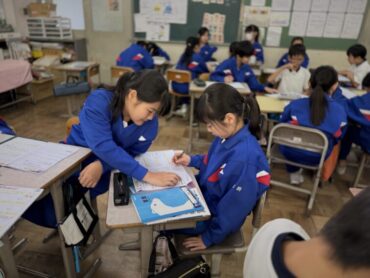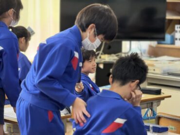 グループになって算数ドリルをしていました。分数と小数の混じったたし算やひき算の計算問題です。困っている児童に分かった児童や早く終わった児童がアドバイスをしていました。