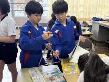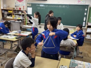 理科で音が出ているときのトライアングルの様子を調べていました。たたいた後の様子をじっと観察したり、三角形の枠に触れたりして、振動があること等、気付いたことをノートに記録しました。