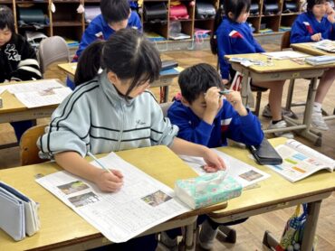 この前に行った校外学習で言ったスーパーについての新聞づくりをしていました。写真を入れたり、見出しに色を塗って目立たせたり、見やすくなる工夫をして、楽しく作業していました。