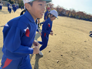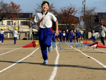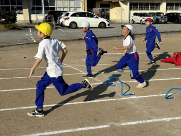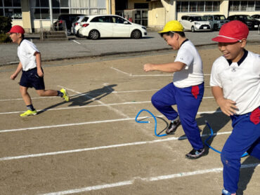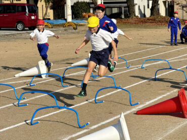 体育の授業で、ハードル走の基となるミニハードルを使った練習をしました。元気いっぱいに4年生は笑顔でゴールラインをを駆け抜けました。