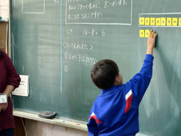 算数の時間にブロックを使ってひき算の勉強をしました。14-8を計算するにはどうすればよいかを考えて、自分のやり方を前に出て発表しました。