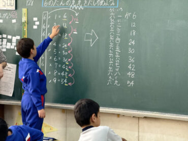 九九の勉強も6の段まで進んでいました。かけ算のかけられる数とかける数の関係や、九九の言い方等、気付いたことを進んで発表しました。