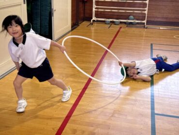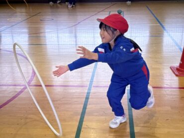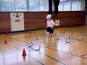 体育の授業で、体つくり運動をしていました。いろいろなコースに分かれて、フラフープ、ミニハードル、ボール等を使って、楽しく体を動かしました。