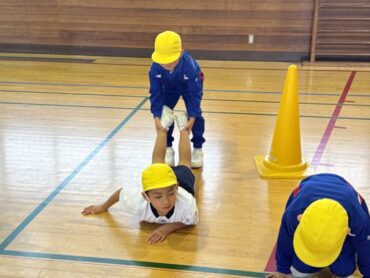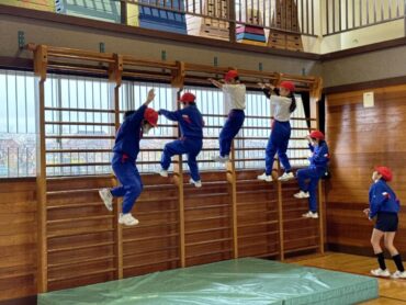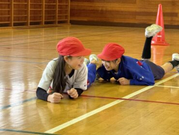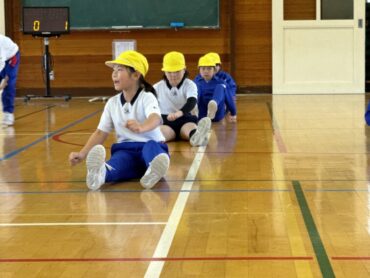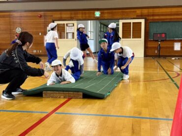 体育の授業では、体つくりの運動をしている場面でした。最初はフロアで腕やお尻の筋肉を使った動きをしていましたが、体が温まったところで、ろく木やマット、カラーコーンのコーナーを順番に体験しました。
