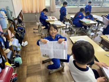 国語のテストが返されて、直しをしたり、直し終わったプリントを先生に見てもらったりしているところでした。何人かの2年生が「100点だった!」と嬉しそうにテストを見せてくれました。大変よくできました!