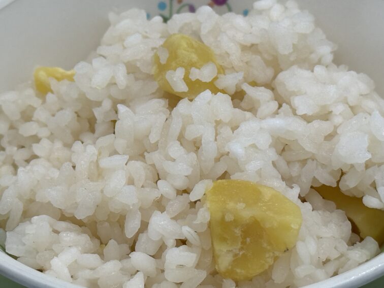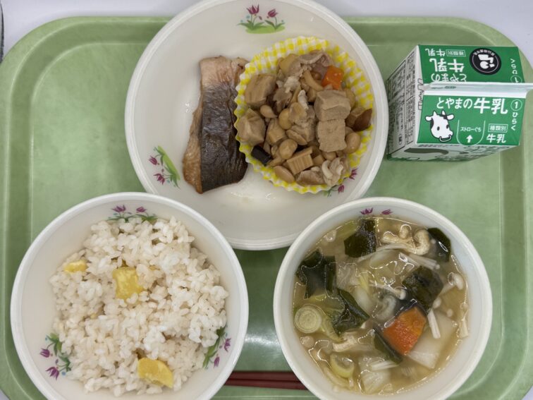 今日の郷土食献立は、「五目豆」です。五目豆の「五目」とは、5種類の材料を使うということではなく「多くの食材を使う」という意味です。五目豆に使用されている大豆は、「畑の肉」と言われるほど栄養価が高く、私たちの筋肉や血液等を作る上で、欠かせないタンパク質を多く含んでいます。