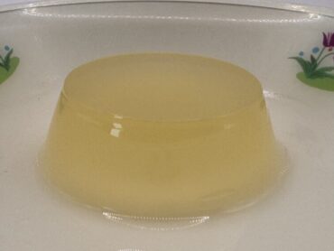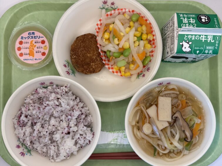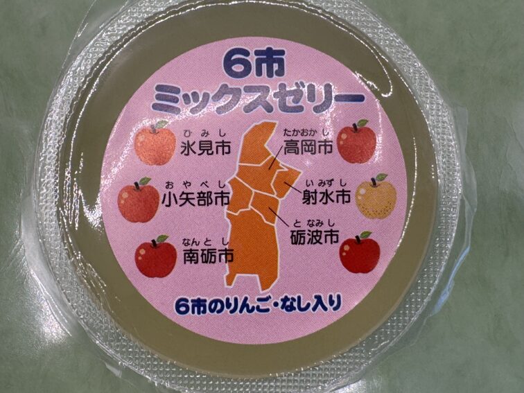 デザートは、6市ミックスゼリーです。射水市のなし果汁と、高岡・砺波・小矢部・南砺・氷見市のりんごの果汁が入っています。6市のおいしい味のつまったゼリーを食べられるのは、今日だけです。